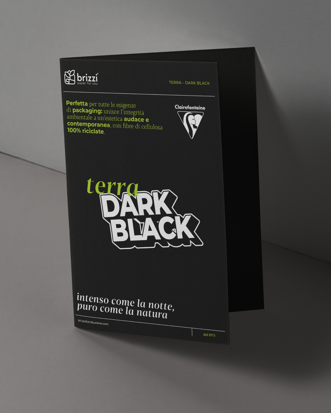 - Terra Dark Black, cartoncino dal nero profondo, riciclato al 100%, per packaging di fascia alta.
