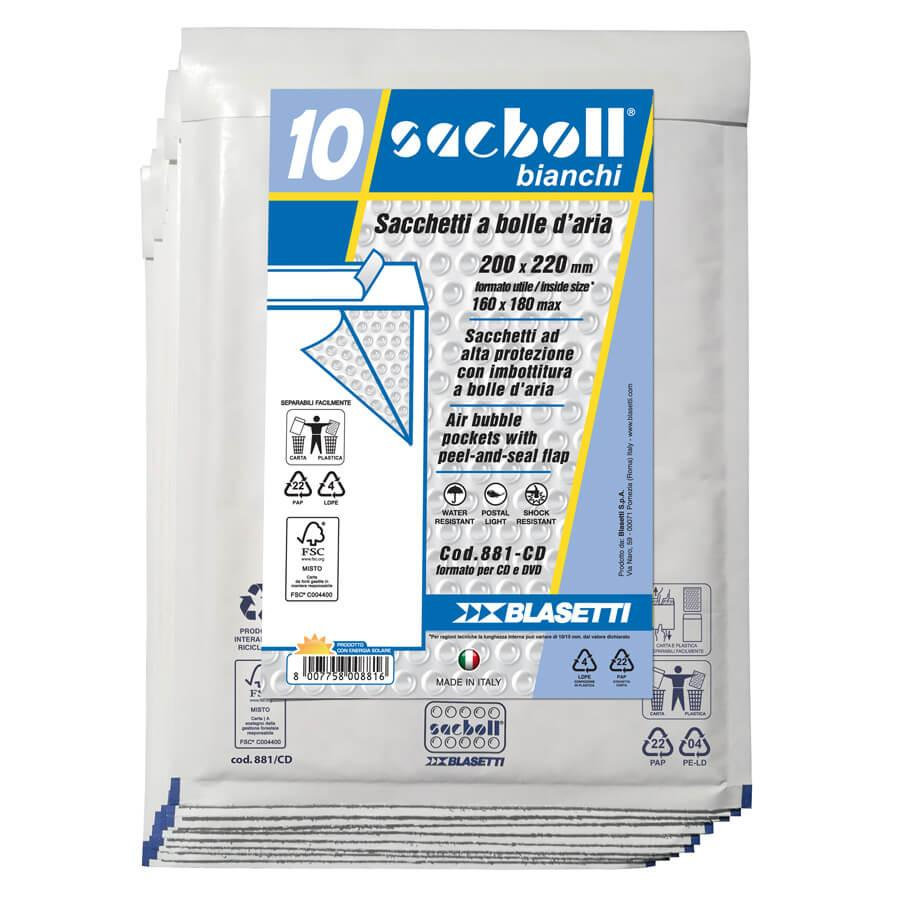 Sacchetti Sacboll con imbottitura interna in polietilene a bolle d’aria, realizzati in carta bianca certificata FSC®. L’elevata resistenza si accompagna alla pratica separazione tra carta e plastica per il corretto smaltimento. Dotati di chiusura con nastro adesivo ad alta tenuta.